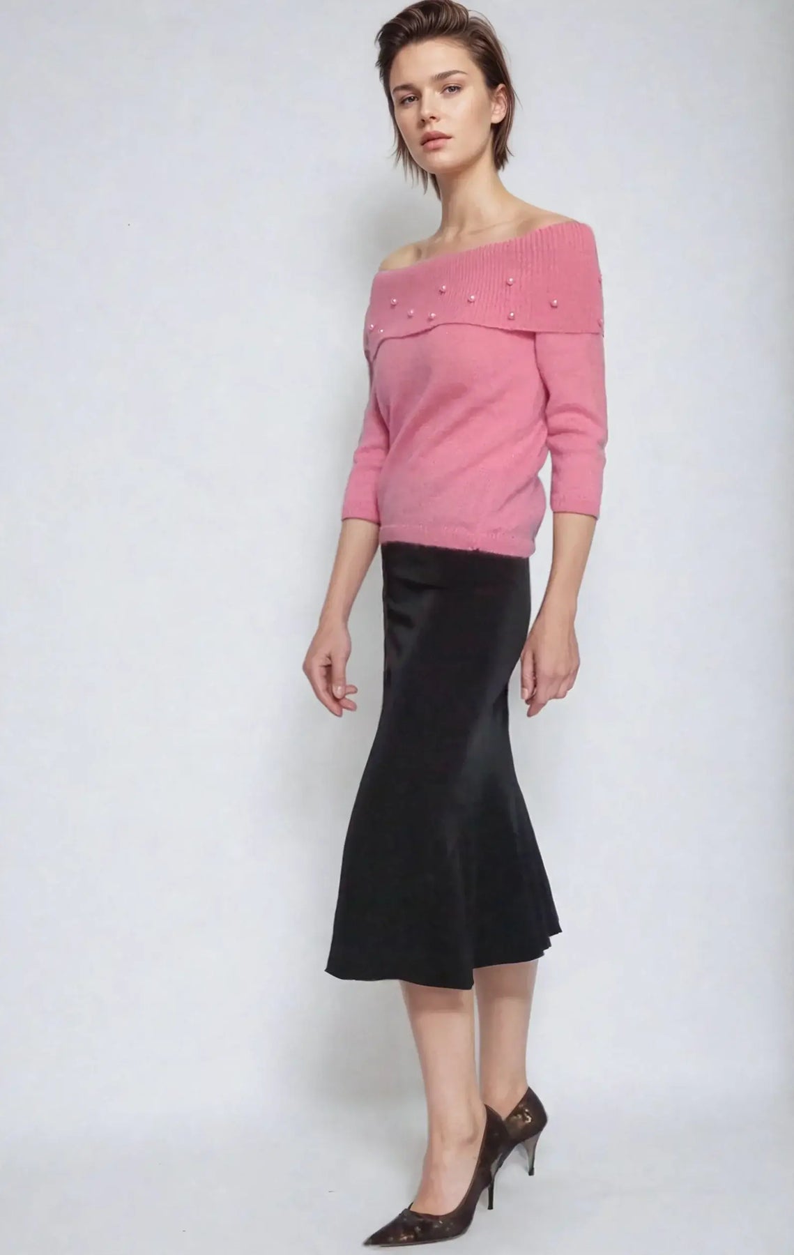 Light pink off-shoulder Marilyn Monroe inspired sweater with pearl detailing, paired with a black skirt and heels.
